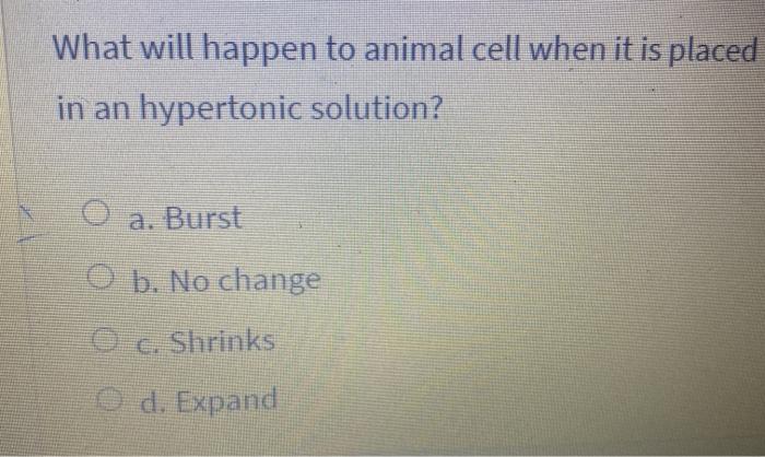 What Happens When You Place A Cell In A Hypotonic Solution Quora from qph.fs.quoracdn.net If a cell is immersed in a hypertonic solution water will leave the cell to dilute the solution outside. Mar 03, 2021 · a hypertonic solution is a solution that is apparently opposite of the hypotonic solution. When a plant cell is placed in a hypertonic solution, more water leaves than enter the cell and the result is a flaccid plant cell. When a cell is placed in a hypertonic solution, the movement of water occurs out of the cell resulting in exosmosis. Old organelles, viruses and bacteria that a cell can ingest are broken down in a. Animal cells swell or shrink when placed in hypotonic or hypertonic solutions, respectively. A cell that contains a large central vacuole is a. Dec 12, 2018 · since water tends to flow out of the cell, cells placed in a hypertonic solution will shrink.